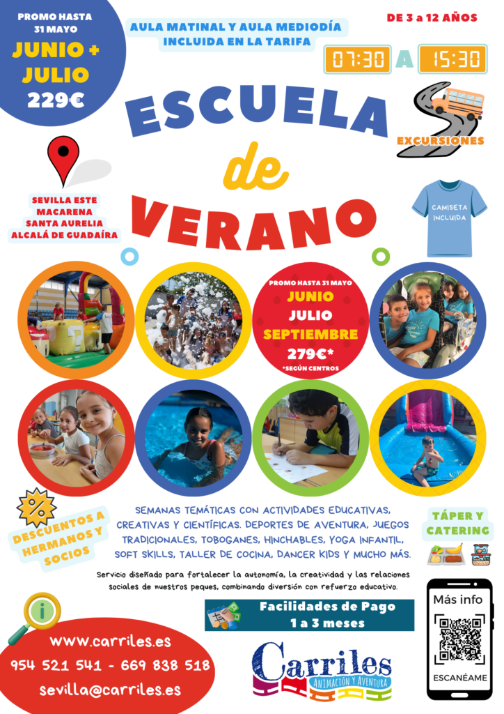 El horario es de 7:30 a 15:30, de lunes a viernes, con un programa adaptado a cada edad que incluye juegos deportivos, música, cocina, manualidades y actividades acuáticas.